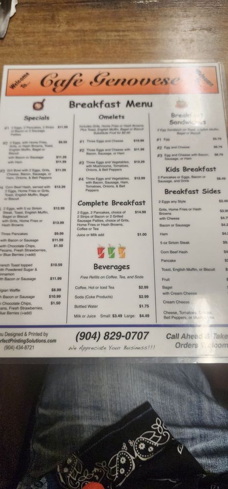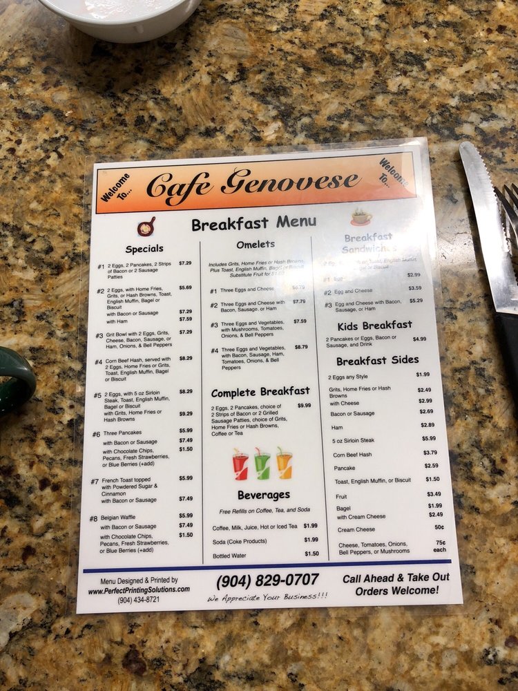 “ What a small but quaint breakfast spot in the St Johns county. We came in around 10:30 am and as patrons were leaving, and empty table was ours for the taking. We had our grand with us which was a treat. He ordered simple eggs and bacon. Wifey had alittle bit of this and a little bit of that. I had the number 5 including corn beef hash, french fries, scrambled eggs and rye toast! The back of the shirt said, "A place where everyone knows your name". I wanted to shout to the roof top, " I m Jerry!, and this is my wife Ramona and our grandson Nolan. We got the check and was off to the races. The owner was engaged in deep conversation so there was bo thank for coming needed. We will be back! Sorry IHOP and Dennys, Cafe Genovese has hit a bullseye withe Henriquez clan! ”