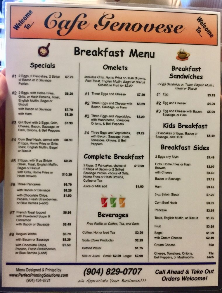 “ My parents asked me over Christmas break if I wanted to meet them for breakfast, so since I've never been here, I decided to take the leap. My son, niece, and myself met my parents here for breakfast. It's located in a stripmall on 210. Beware, this whole stripmall has a pretty tight (or at least for me) parking lot, so backing out, can be a bit tight. Also, if you're coming from the Beachwalk area, making a right into this plaza (especially in the morning and around the time the high school is starting can take a bit). Once we parked we entered Cafe Genovese. It reminded me of the little mom and pop diners we had in upstate New York. You def get the small town feel, and based on my observations, they had many regulars. Our server quickly came to our table, handed us menus, and asked us for our drink orders. She was chipper and happy to help. I ordered a pretty standard breakfast: scrambled eggs, toast, home fries, and a coffee. My kiddo got scrambled eggs, toast, and a side of bacon, and my niece ordered one pancake. Our drinks were quickly refilled. The other server was quick to see if we needed napkins, both servers were on top of customer needs. Our breakfasts came out quickly. Every tasted good. It's pretty nofrills, but that shouldn't deter you from coming here. If you're looking for reasonable prices, quick and friendly service, this is the place. ”